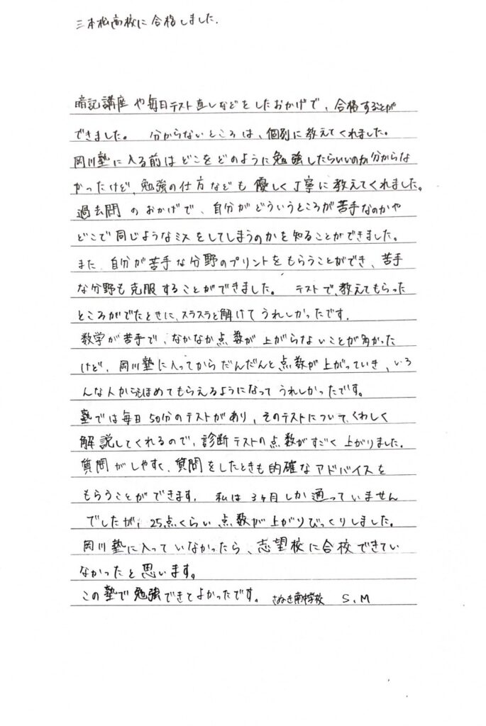 岡川塾が対策として提供した教材・授業内容は、実際の入試問題の99%をカバーしていました。「塾でやった問題がそのまま出た!」という生徒たちの驚きと自信が、合格への大きな原動力となっています。