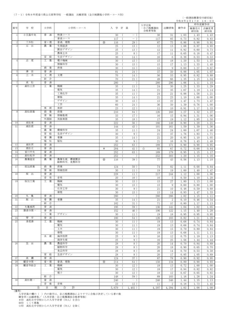 2026年度 香川県公立高校入試 倍率速報