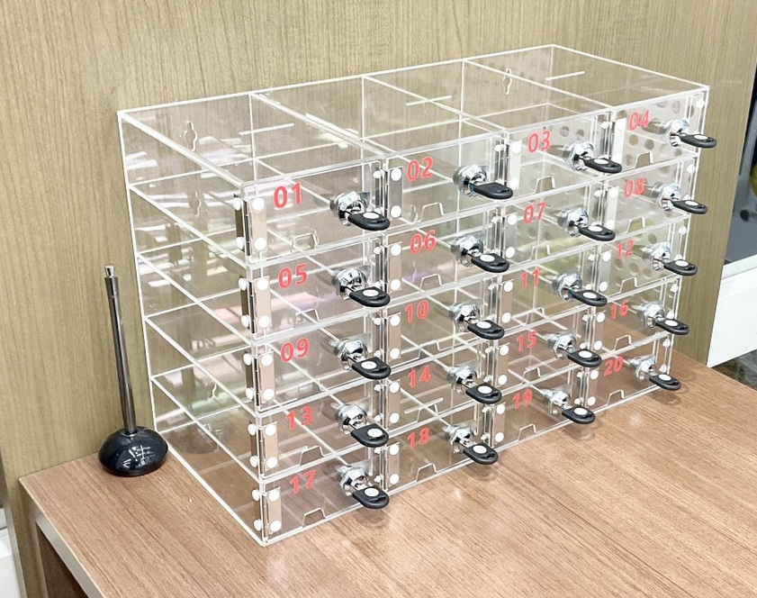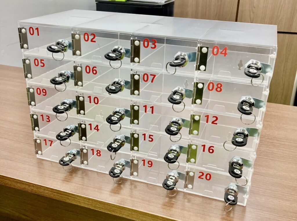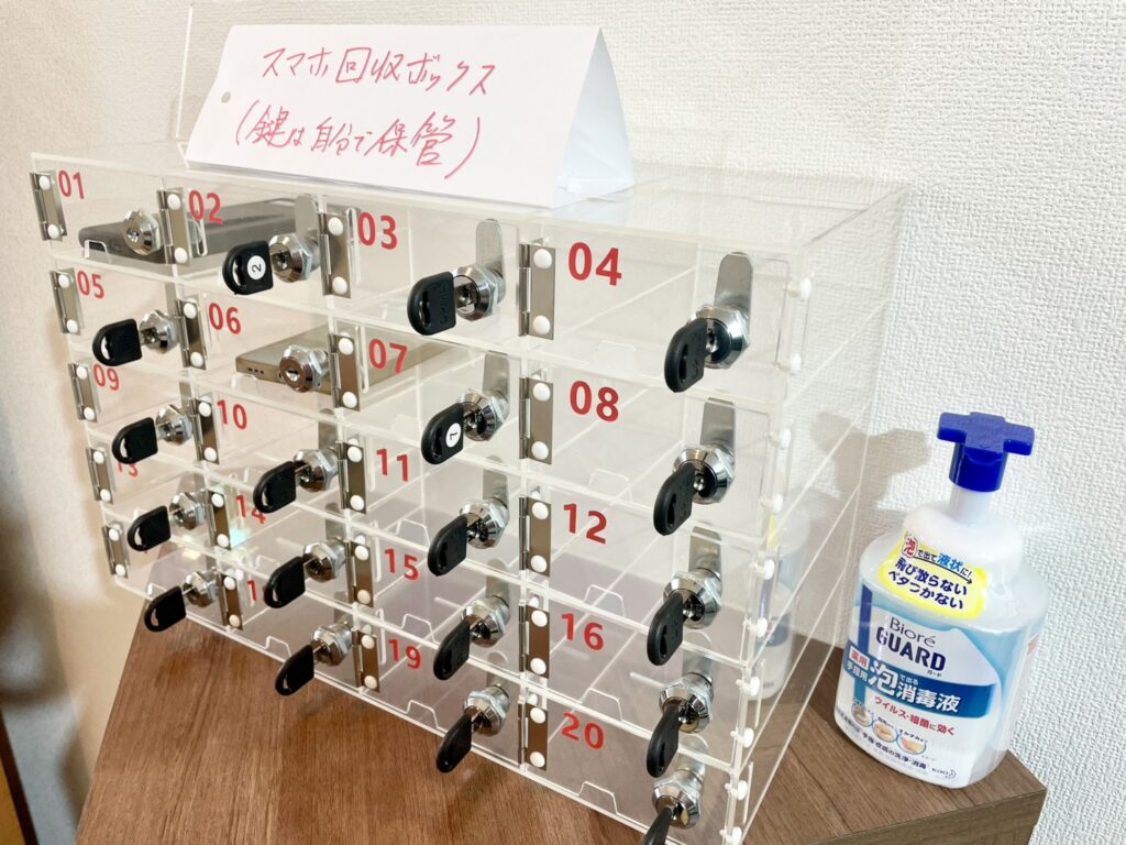 スマホボックスにスマホを預けて勉強できます。個別に鍵付きなので、防犯面でも安心です。