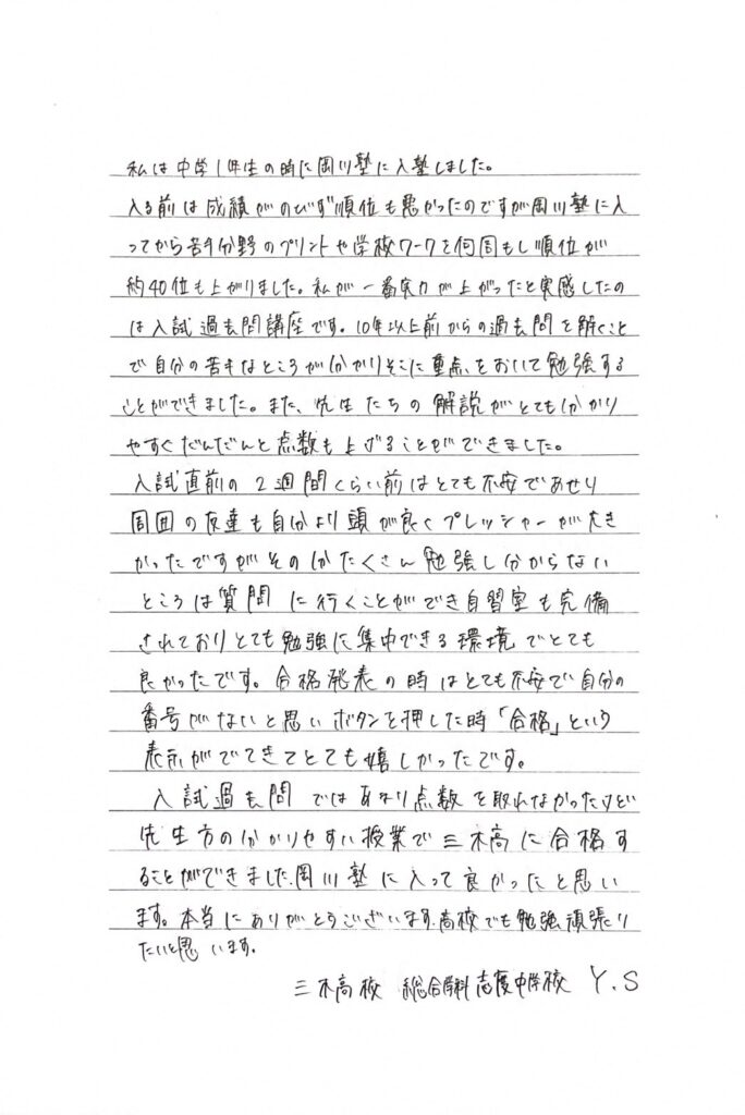 三木高校 総合学科に合格しました。私は中学1年生の時に岡川塾に入塾しました。入る前は成績がのびず順位も悪かったのですが岡川塾に入ってから苦手分野のプリントや学校ワークを何回もし順位が約40位も上がりました。私が一番実力が上がったと実感したのは入試過去問講座です。10年以上前からの過去問を解くことで自分の苦手なところが分かりそこに重点をおいて勉強することができました。また、先生たちの解説がとても分かりやすくだんだんと点数も上げることができました。入試直前の2週間くらい前はとても不安であせり周囲の友達も自分より頭が良くてプレッシャーが大きかったのですがその分たくさん勉強し分からないところは質問に行くことができ自習室も完備されておりとても勉強に集中できる環境でとても良かったです。合格発表の時はとても不安で自分の番号がないと思いボタンを押した時「合格」という表示がでてきてとても嬉しかったのです。入試過去問ではあまり点数を取れなかったけれど先生方の分かりやすい授業で三木高に合格することができました。岡川塾に入って良かったと思います。本当にありがとうございます。高校でも勉強頑張りたいと思います。