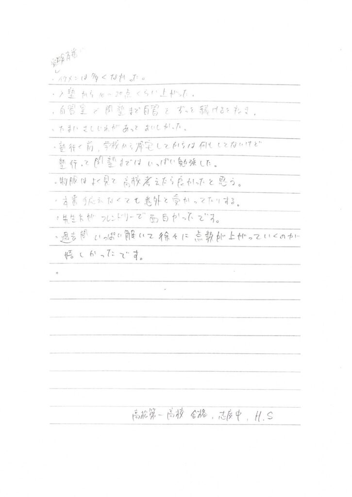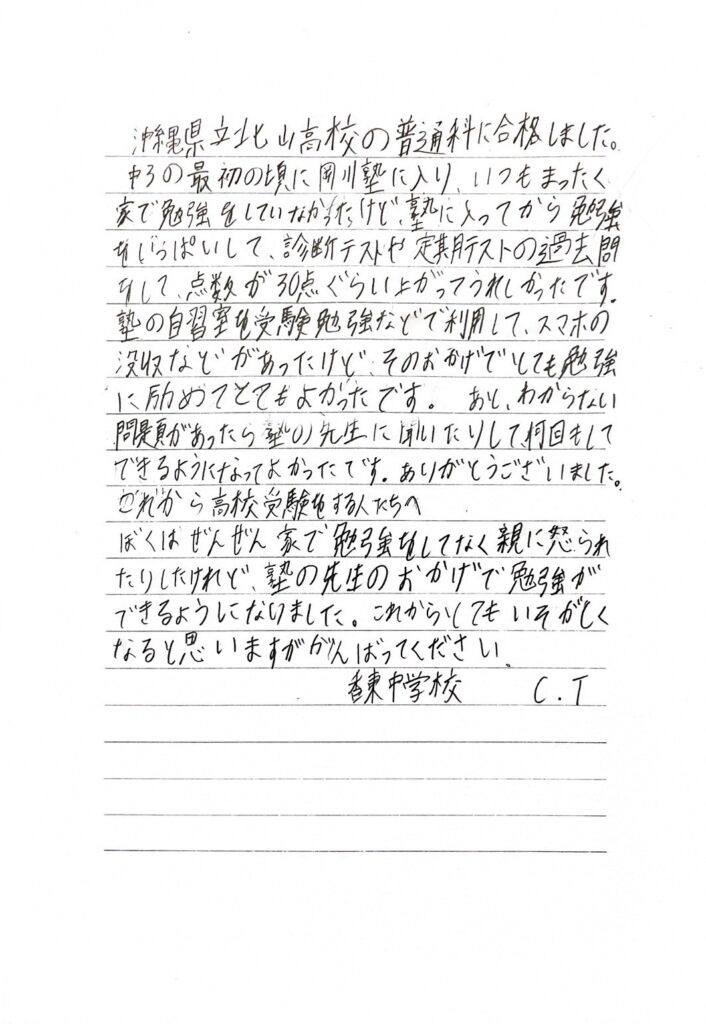 沖縄県立北山高校の普通科に合格しました。中3の最初の頃に岡川塾に入り、いつもまったく家で勉強をしていなかったけど、塾に入ってから勉強をいっぱいして、診断テストや定期テストの過去問をして、点数が30点ぐらい上がってうれしかったです。塾の自習室も受験勉強などで利用して、スマホの没収などがあったけど、そのおかげでとても勉強に励めてとてもよかったです。あと、わからない問題があったら塾の先生に聞いたりして何回もしてできるようになってよかったです。ありがとうございました。これから高校受験する人たちのぼくはぜんぜん家で勉強をしてなく親に怒られたりしたけれど、塾の先生のおかげで勉強ができるようになりました。これからもいそがしくなると思いますががんばってください。