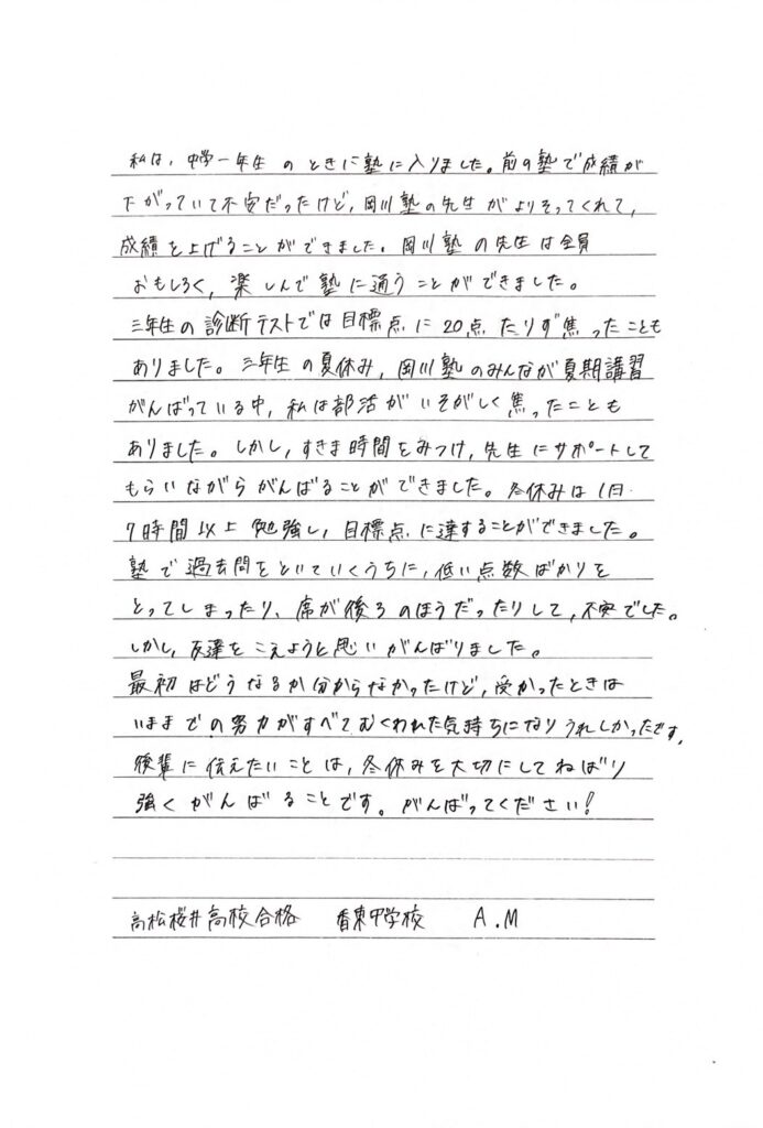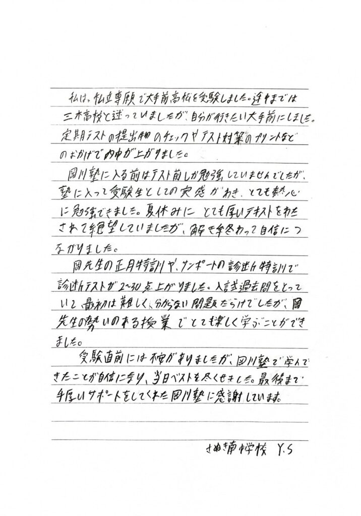 私は、私立専願で大手前高松に合格しました。途中までは三木高校と迷っていましたが、自分が行きたい大手前にしました。定期テストの提出物のチェックやテスト対策のプリントなどのおかげで内申が上がりました。岡川塾に入る前はテスト前しか勉強していませんでしたが、塾に入って受験生としての実感がわき、とても熱心に勉強できました。夏休みにとても厚いテキストをわたされて絶望していましたが、解き終わって自信につながりました。岡先生の正月特訓や、サンポートの診断特訓で診断テストが20〜30点上がりました。入試過去問をといて、最初は難しく、分からない問題だらけでしたが、岡先生の勢いのある授業でとても楽しく学ぶことができました。受験直前には不安がありましたが、岡川塾で学んできたことが自信になり、当日ベストを尽くせました。最後まで手厚いサポートをしてくれた岡川塾に感謝しています。