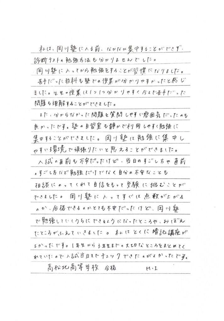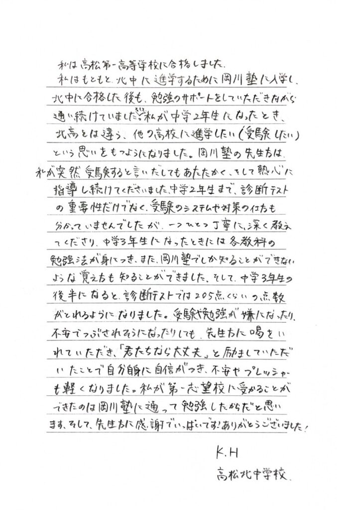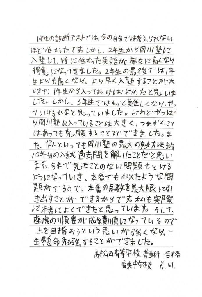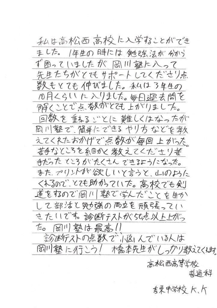 高松第一高等学校に合格しました。私は中学3年生の夏に、岡川塾に入塾しました。もともと勉強が好きではなく、熱心に取り組めるタイプでもありませんでした。初めて塾へ入ったため、初めてのことばかりで大変でしたが、先生方にたくさんサポートしていただき、自分にとってとても高い目標にも全力で取り組むことができました。入塾する前までは、家で勉強する時間は長くても、内容がとても薄い状態でした。入塾したことで完璧な学習環境、全力で応援してくださる先生方、最強な入試、診断の過去問を味方にさせていただき合格といった結果を得ることができたと思っています。成績は診断173点、かとうもし約150点ぐらい(平均)過去問160点から、診断199点、かとうもし約190点ぐらい、過去問約200点(年度によりますが)まで上げることができました。今までの塾生の話をきいて本当に詐欺かと疑っていたのですが、合格するためにと入塾を決心して本当によかったと思っています。自習教室、土日をふくめて、冬休みから最後は塾に毎日通い、先生方にたくさんお世話になりました。本当にありがとうございました!!入塾を希望しようとしている人は、ぜひ入り、全力で勉強を楽しむことをしてください!!