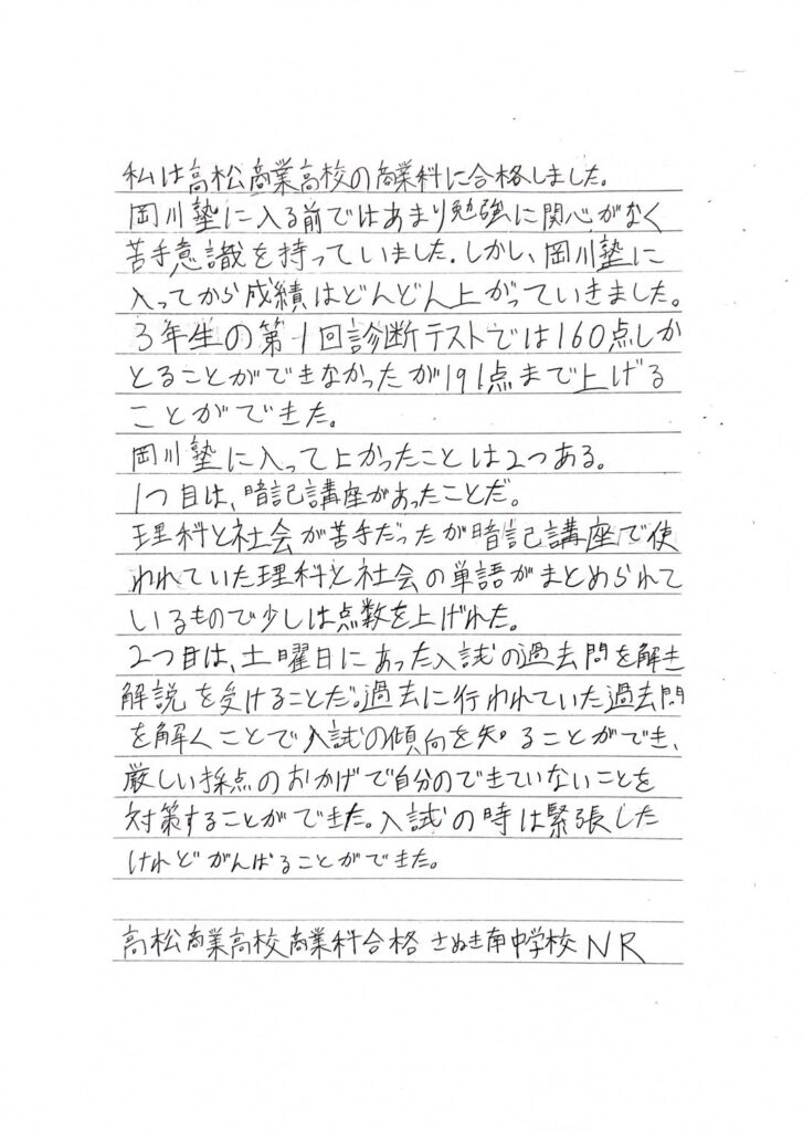 私は高松商業高校の商業科に合格しました。岡川塾に入る前ではあまり勉強に関心がなく苦手意識を持っていました。しかし、岡川塾に入ってから成績はどんどん上がっていきました。3年生の第1回診断テストでは160点しかとることができなかったが191点まで上げることができた。岡川塾に入ってよかったことは2つある。1つ目は、暗記講座があったことだ。理科と社会が苦手だったが暗記講座で使われていた理科と社会の単語がまとめられているもので少しは点数を上げれた。2つ目は、土曜日にあった入試の過去問を解き解説を受けることだ。過去に行われていた過去問を解くことで入試の傾向を知ることができ、厳しい採点のおかげで自分のできていないことを対策することができた。入試の時は緊張したけれどがんばることができた。