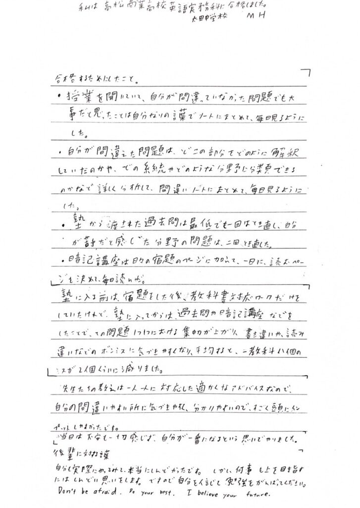 私は高松商業高校英語実務科に合格しました。合格するためにしたこと。・授業を聞いていて、自分が間違っていなかった問題でも大事だと思ったことは自分なりの言葉でノートにまとめて、毎日見るようにした。・自分が間違えた問題は、どこの部分をどのように解釈していたのかや、どの系統やどのような分野に分類できるのかなどで詳しく分析して、間違いノートにまとめて、毎日見るようにした。・塾から渡された過去問は最低でも一回はとき直し、自分が苦手だと感じた分野の問題は、二回とき直した。・暗記講座は日の宿題のページに加えて、一日に読むページも決めて、毎日読んだ。塾に入る前は、宿題をした後、教科書対応ワークだけをしていたけれど、塾に入ってからは、過去問や暗記講座などしたことで、一問一問における集中力が上がり、書き違いや読み違いなどの凡ミスに気づきやすくなり、平均すると、一教科11個のミスが2個くらいに減りました。先生たちの教えは一人一人に対応した適確なアドバイスなので、自分の間違いやすい所に気づきやすく、分かりやすいので、すごく頭にインプットしやすかったです。当日は不安も一切感じず、自分が一番になるという思いでやりました。後輩に伝える言葉:自分が実際にやってみて、本当にしんどかったです。しかし何事も上を目指すにはしんどい思いをします。ですので自分を信じて勉強をがんばってください。Don't be afraid. Do your best. I believe your future.