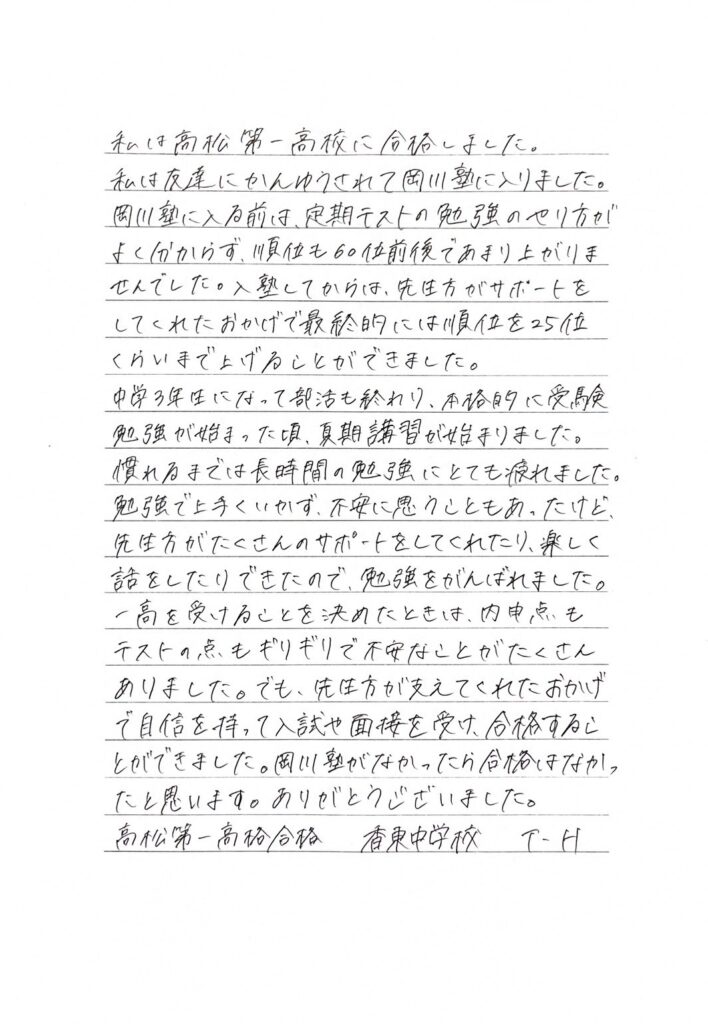 私は高松第一高校に合格しました。私は友達にかんゆうされて岡川塾に入りました。岡川塾に入る前は定期テストの勉強のやり方がよくわからず、順位も60位前後であまり上がりませんでした。入塾してからは、先生方がサポートをしてくれたおかげで最終的には順位を25位くらいまで上げることができました。中学3年生になって部活も終わり、本格的に受験勉強が始まった頃、夏期講習が始まりました。慣れるまでは長時間の勉強にとても疲れました。勉強で上手くいかず、不安に思うこともあったけど、先生方がたくさんのサポートをしてくれたり、楽しく話をしたりできたので、勉強をがんばれました。一高を受けることを決めたときは、内申点もテストの点もギリギリで不安なことがたくさんありました。でも、先生方が支えてくれたおかげで自信を持って入試や面接を受け、合格することができました。岡川塾がなかったら合格はなかったと思います。ありがとうございました。