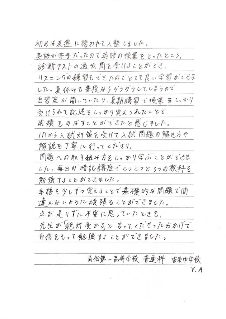 高松第一高等学校 普通科に合格しました 初めは友達に誘われて入塾しました。英語が苦手だったので英語の授業をとったところ、診断テストの過去問を受けることができ、リスニングの練習もできたのでとても良い学習ができました。夏休みも普段ならダラダラしてしまうので自習室が開いていたり、夏期講習で授業をしっかり受けられて記述をしっかり覚えられたことで成績をのばすことができたと感じました。1月から入試対策を受けて入試問題の解き方や解説を丁寧に行ってくださり、問題への取り組み方をしっかり学ぶことができました。毎日の暗記講座でこつこつと3つの教科を勉強することができました。単語を少しずつ覚えることで基礎的な問題で間違えないように頑張ることができました。点が足りずに不安に思っていたときも、先生が「絶対受かる」と言ってくださったおかげで自信をもって勉強することができました。